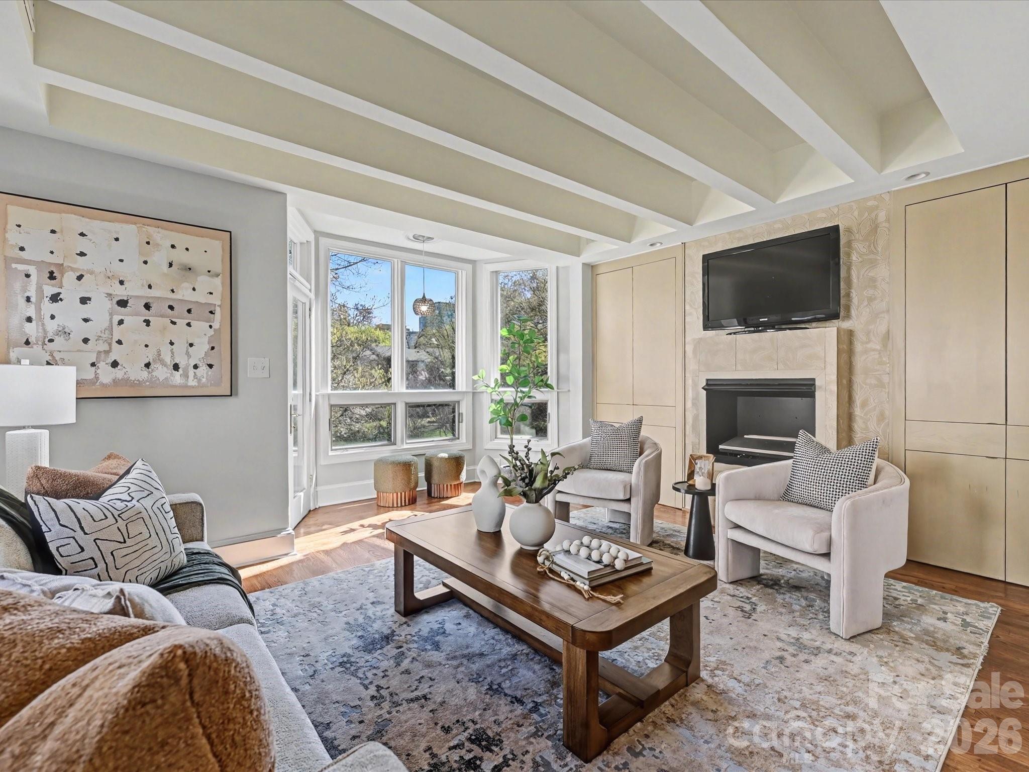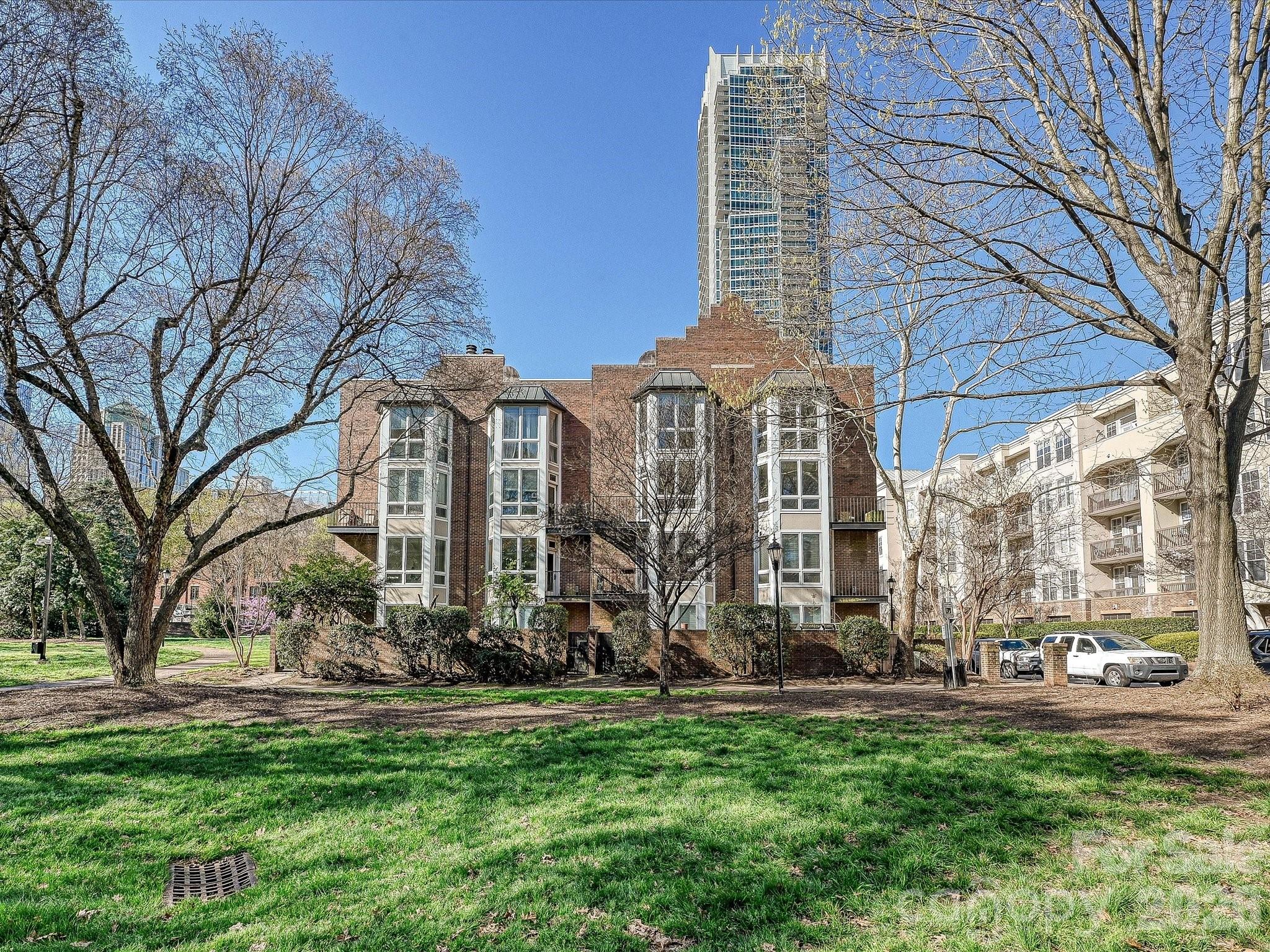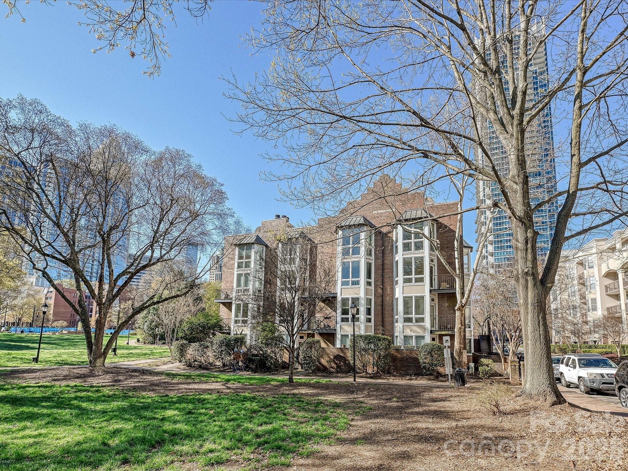 Hidden Gem in Fourth Ward Park! This charming top-level, two-story end-unit condo is nestled in the heart of Fourth Ward with abundant natural light from multiple bay windows. 2 deeded parking spots just steps away from the building. Thoughtfully updated throughout, it features an open floor plan with a renovated kitchen, stainless steel appliances, hardwood floors, exposed beam ceilings, custom built-in storage throughout, and a cozy fireplace. The spacious primary suite includes a large bath with a soaking tub and separate shower. Enjoy a private balcony overlooking the park, two parking spaces, and low monthly dues. Refrigerator, washer, and dryer are included. Low HOA dues. All of this just steps from restaurants, grocery stores, shops, and sports venues—experience the best of uptown Charlotte living!