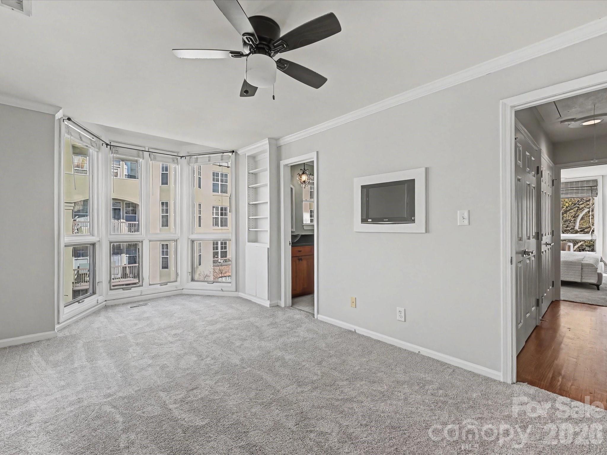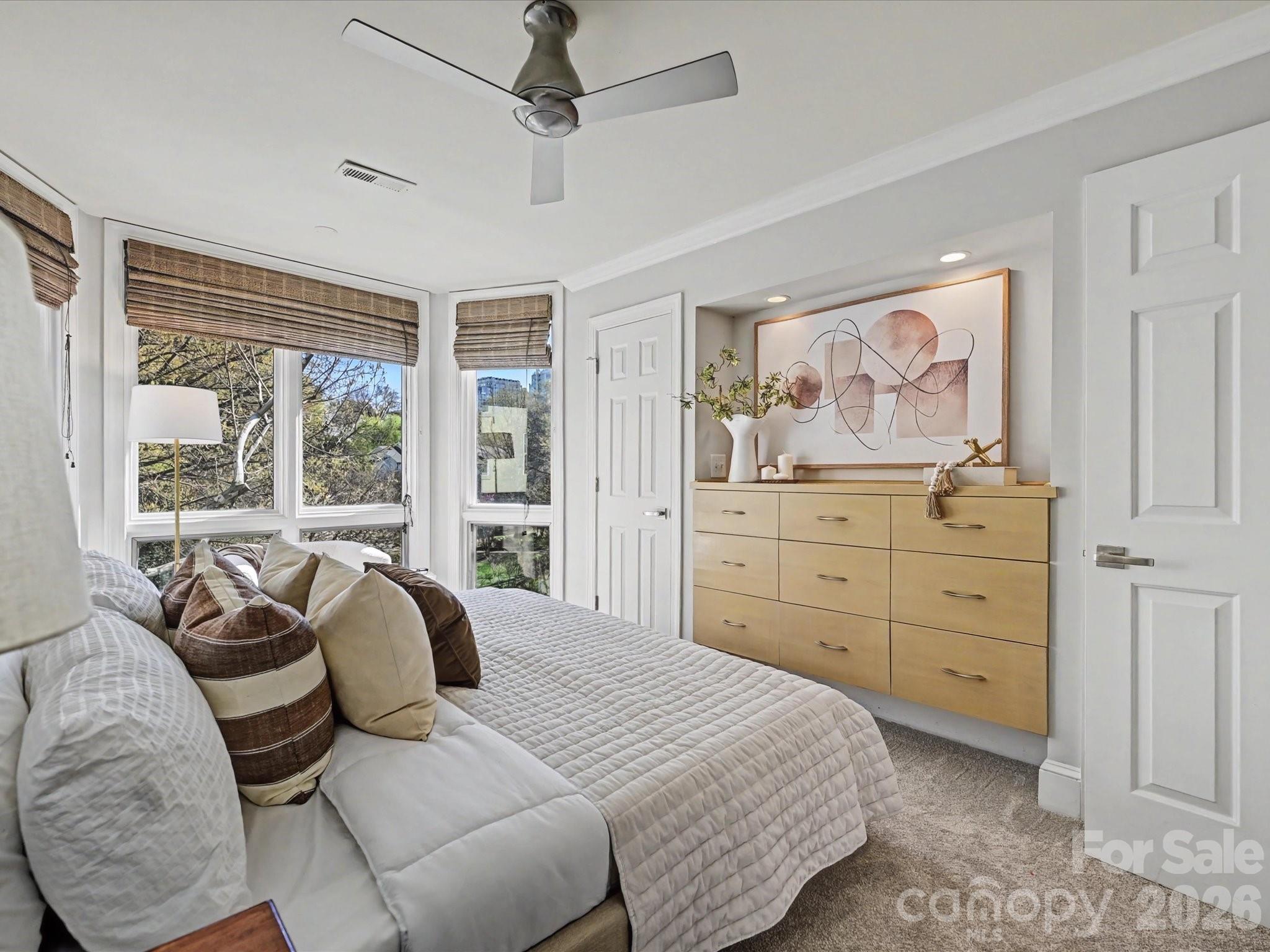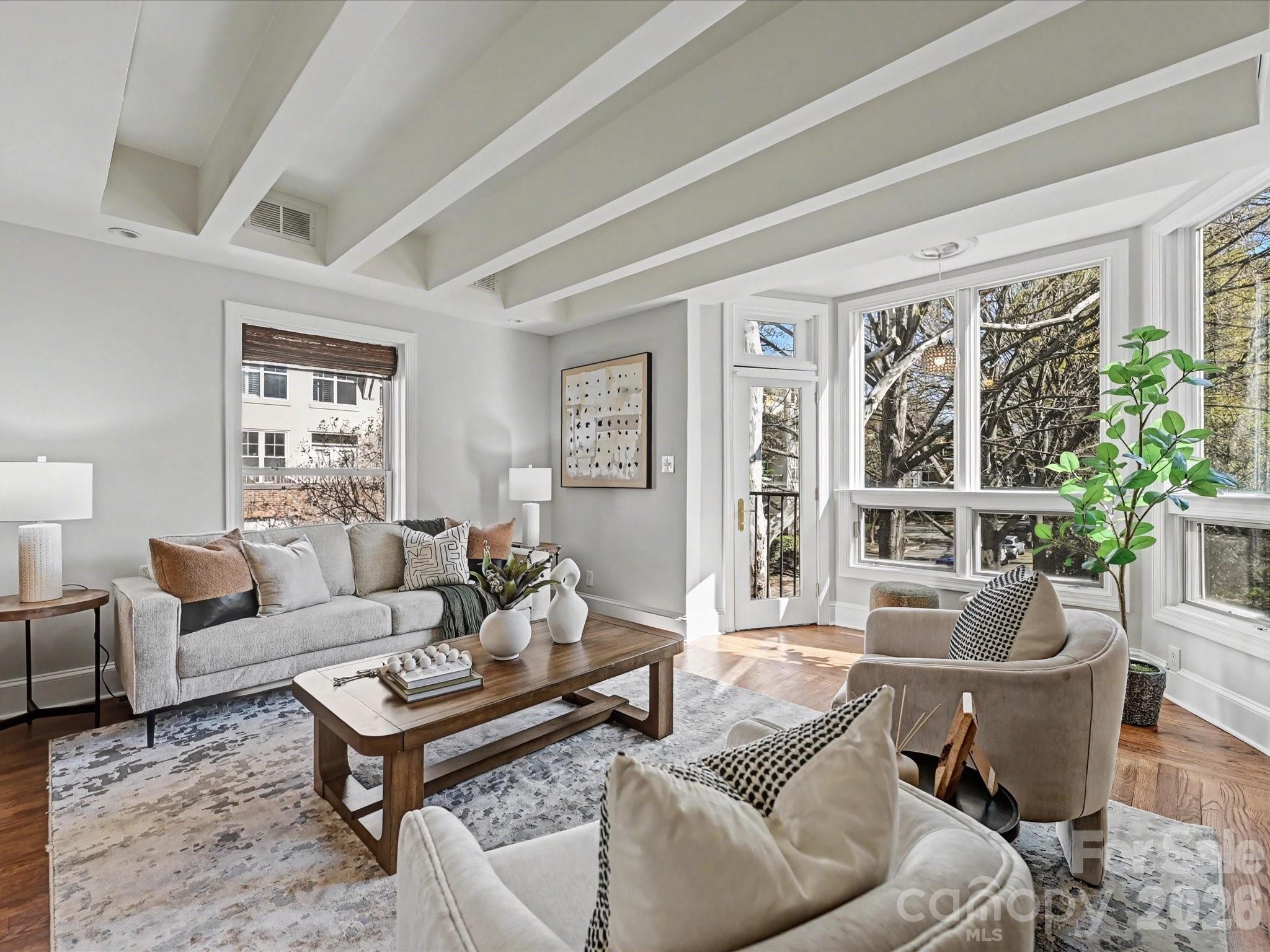 Hidden Gem in Fourth Ward Park! This charming top-level, two-story end-unit condo is nestled in the heart of Fourth Ward with abundant natural light from multiple bay windows. 2 deeded parking spots just steps away from the building. Thoughtfully updated throughout, it features an open floor plan with a renovated kitchen, stainless steel appliances, hardwood floors, exposed beam ceilings, custom built-in storage throughout, and a cozy fireplace. The spacious primary suite includes a large bath with a soaking tub and separate shower. Enjoy a private balcony overlooking the park, two parking spaces, and low monthly dues. Refrigerator, washer, and dryer are included. Low HOA dues. All of this just steps from restaurants, grocery stores, shops, and sports venues—experience the best of uptown Charlotte living!