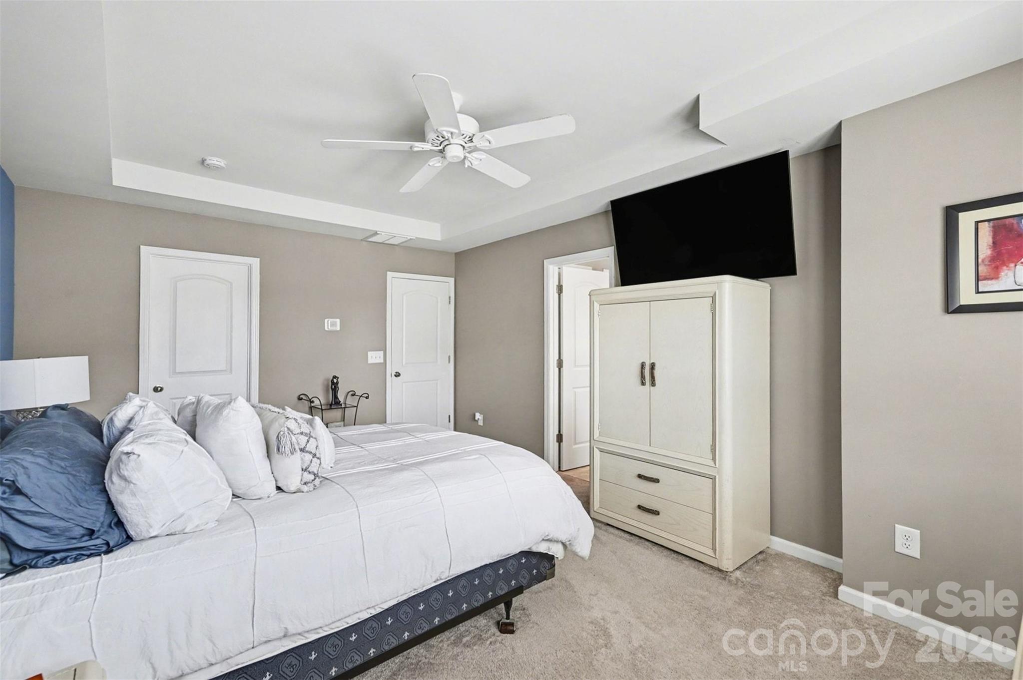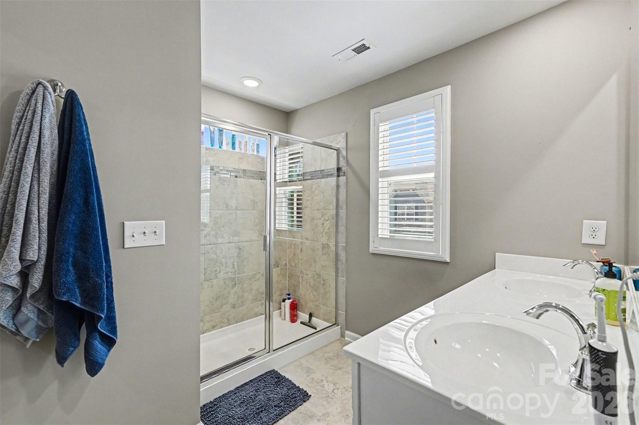 Upstairs, the primary suite is a retreat of its own. A spacious layout, tray ceiling detail, and a spa-like bath with dual vanities and an oversized shower create the perfect place to unwind at the end of the day.