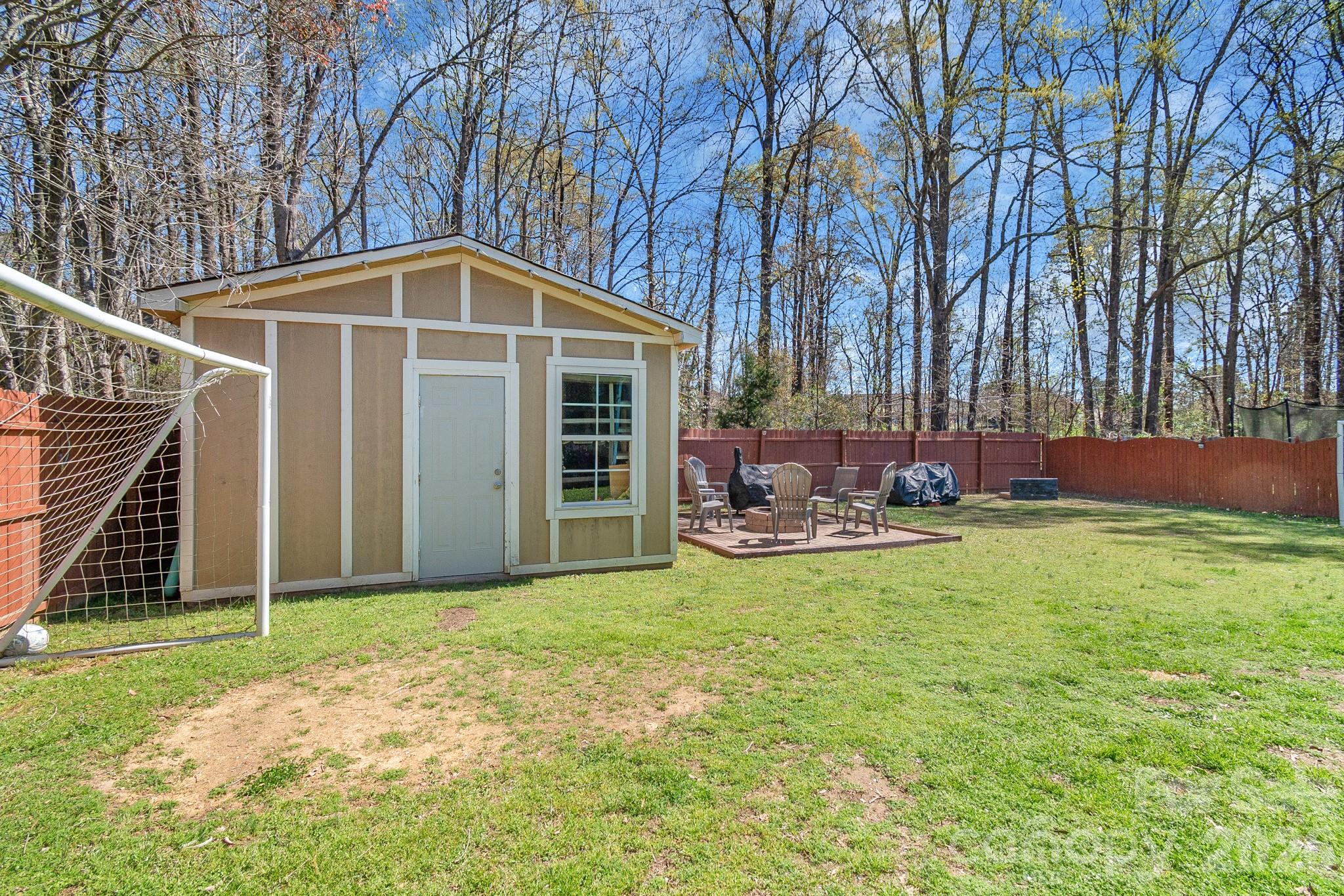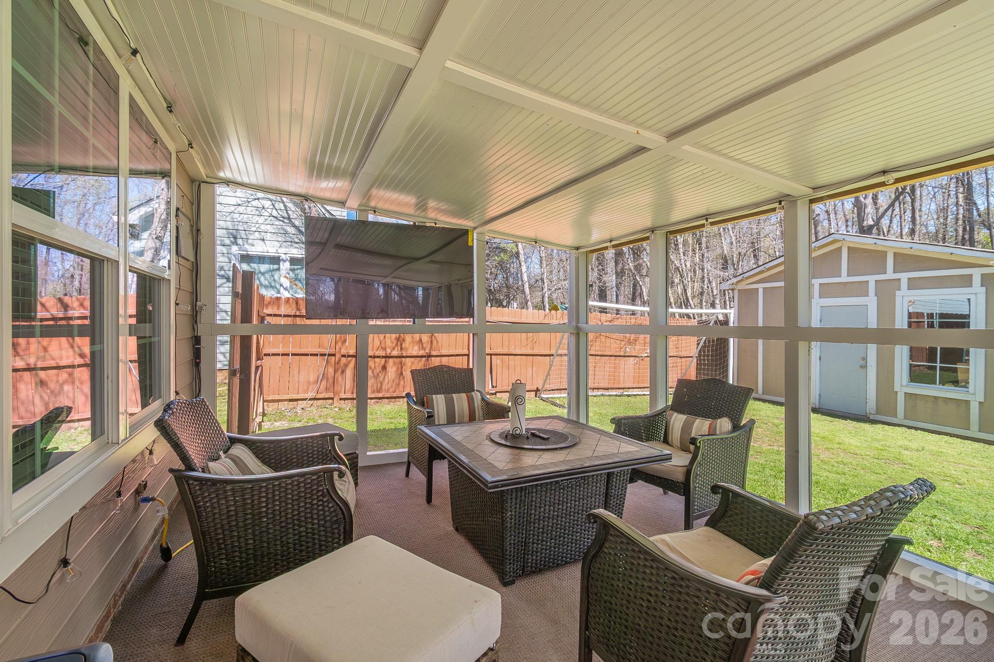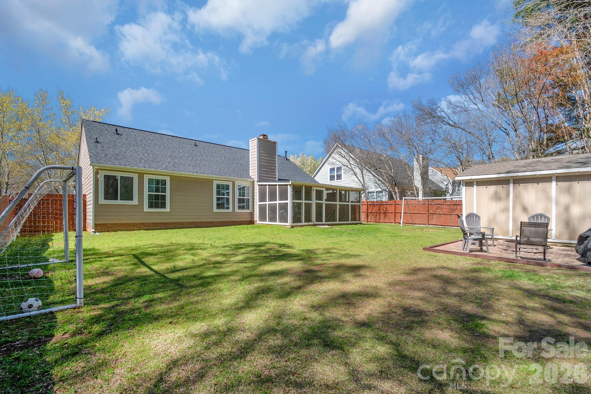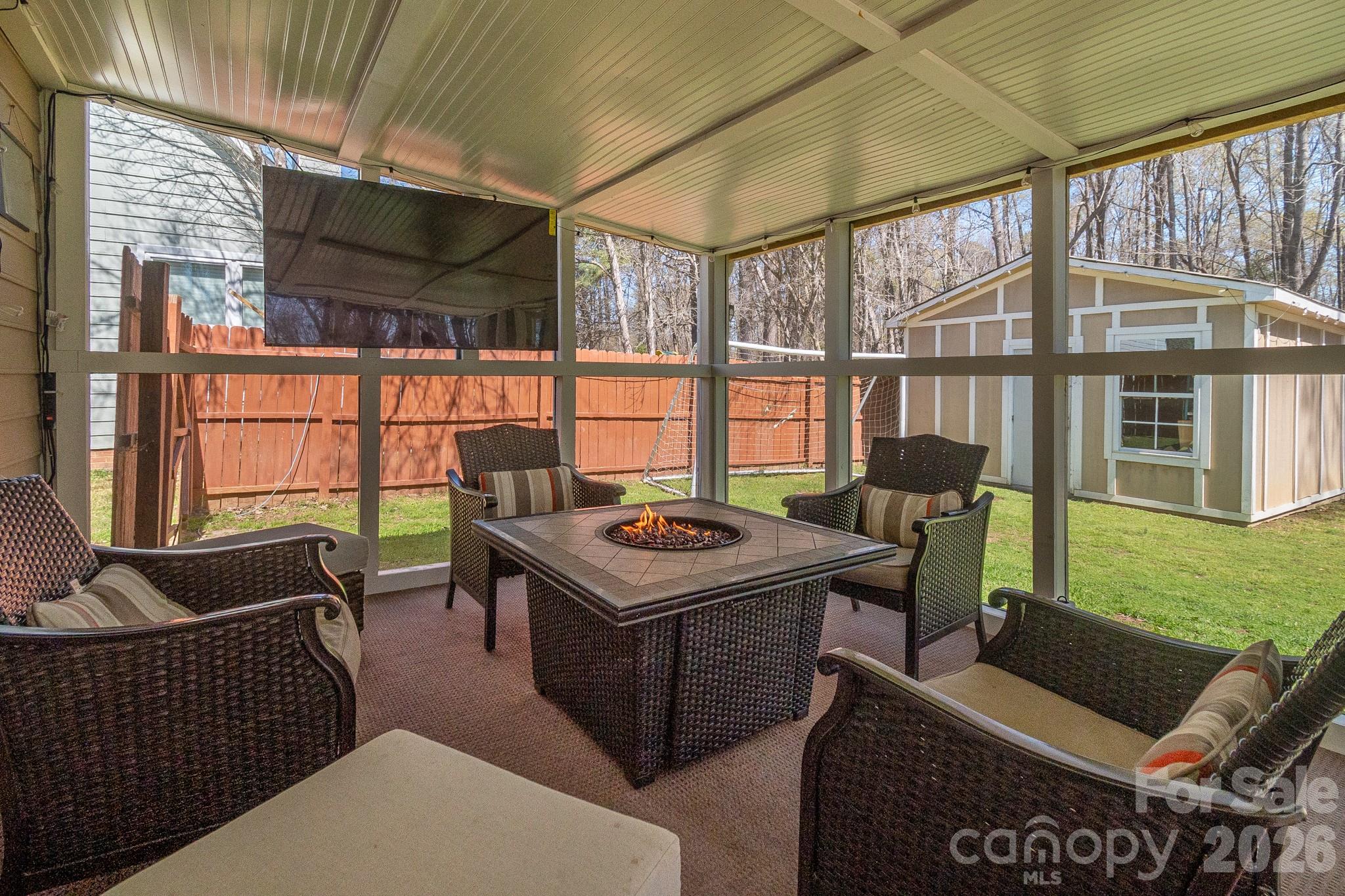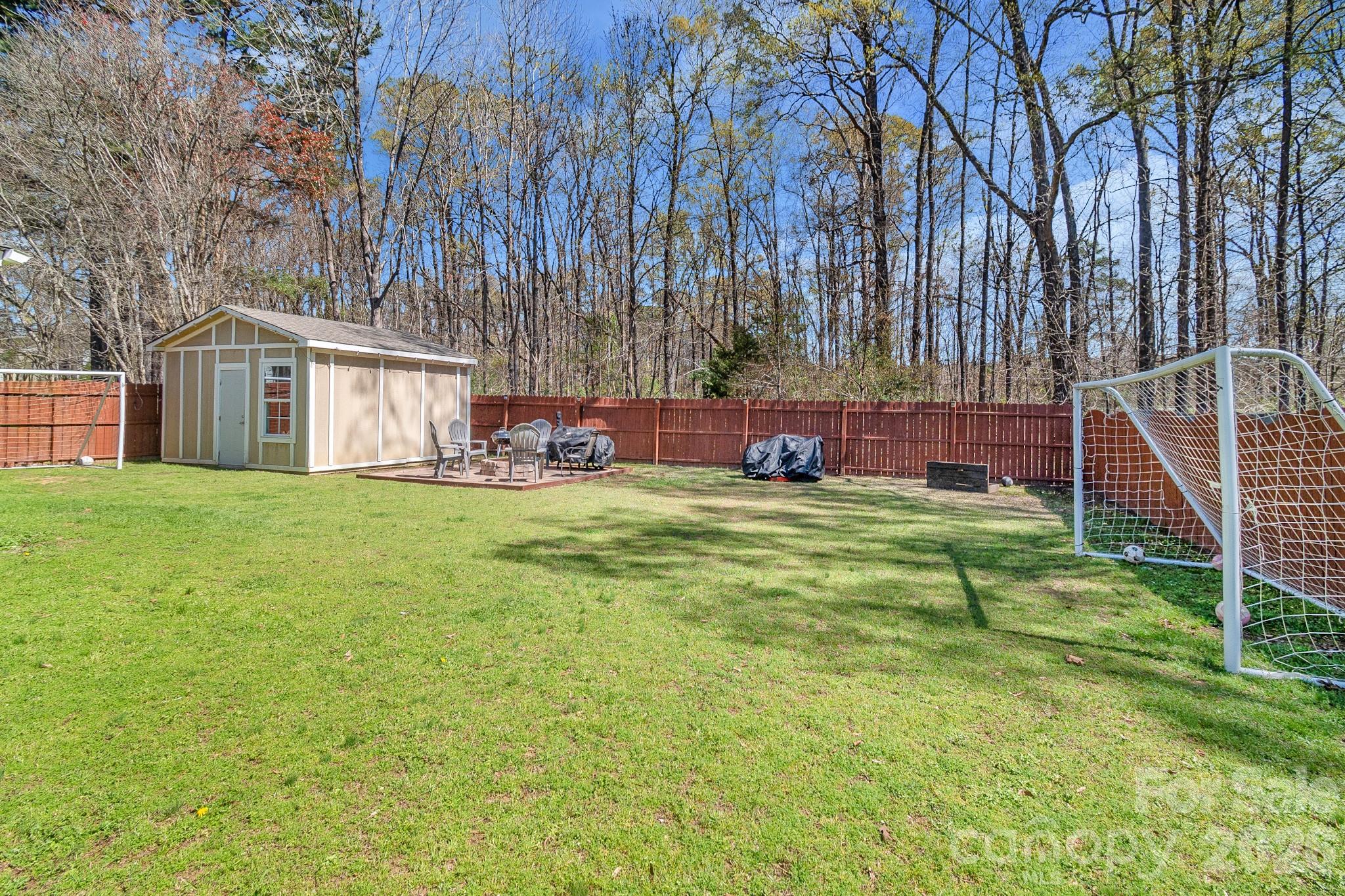 Outdoor living is a highlight, with a newly updated screened porch—complete with new ceiling and carpet from Summer 2025—and a freshly painted deck overlooking a private, fully fenced backyard. The space includes a firepit with chairs, soccer goals, and a storage shed with built-in shelving. The garage also offers wooden shelving for extra organization, along with a brand-new side door installed in March 2026.