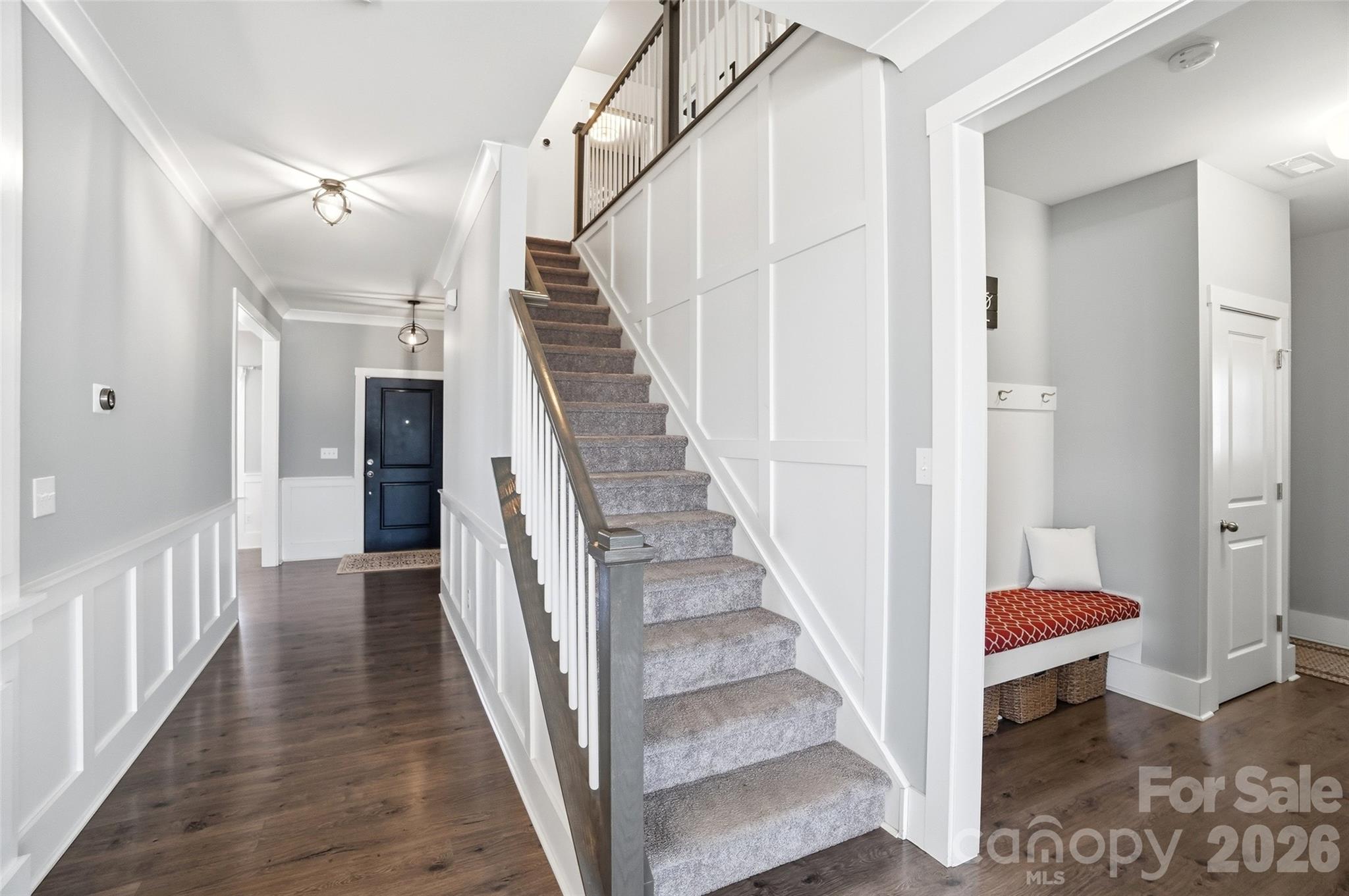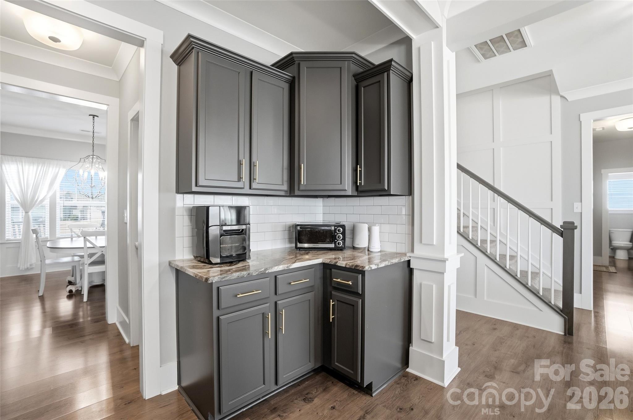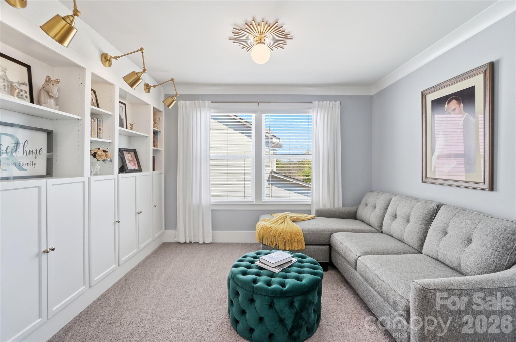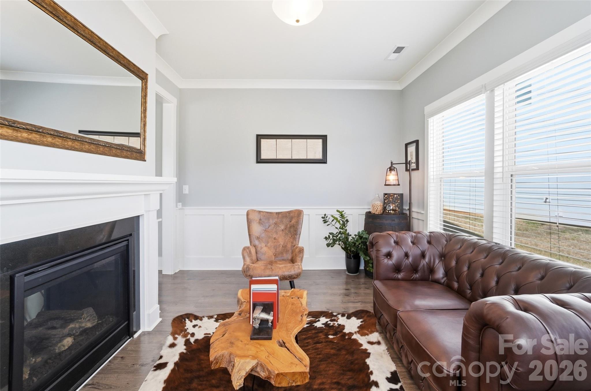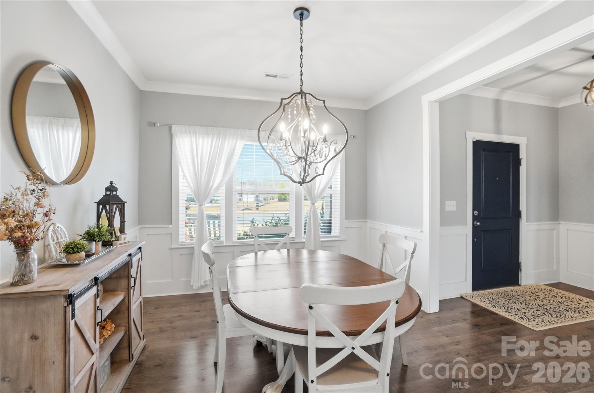 - Crown molding, beautiful flooring, wainscoting, barn doors, built-in cabinetry