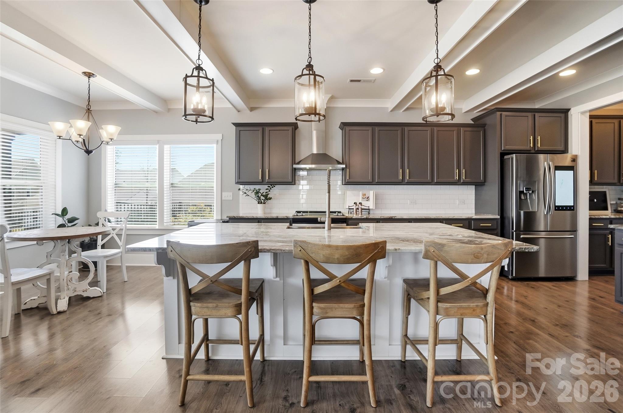 - Custom kitchen with ss appliances, quartzite counters, beams, center island with plenty seating, pantry, and dining area