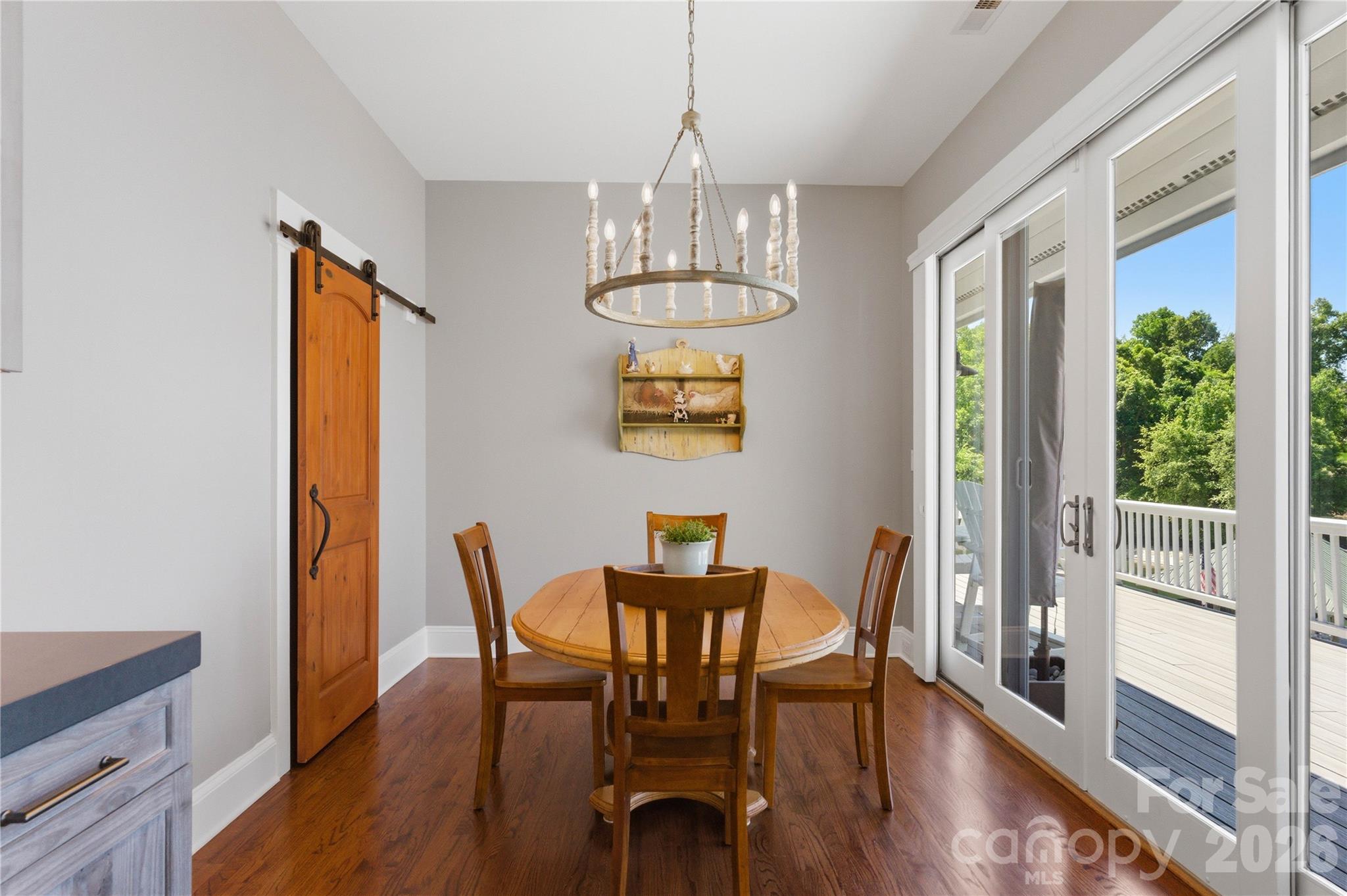 - Beautiful wood floors, vaulted ceilings, rich molding, plantation shutters, barn doors