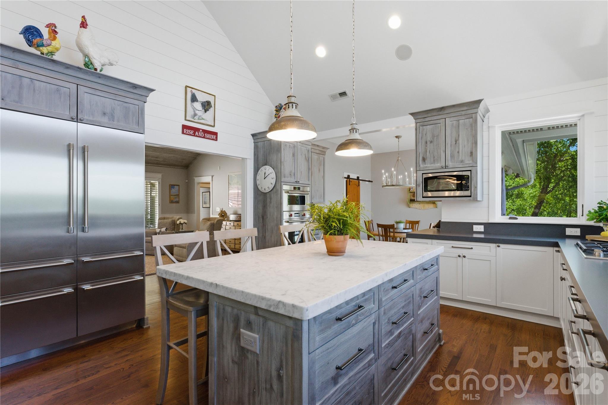 - Newly remodeled gourmet kitchen (2025) with marble counters, ROHL sink, center island with plenty seating, huge walk-in pantry, and professional-grade appliances, including Wolf gas cooktop and Wolf steam oven and convection oven, and a Thermador refrigerator