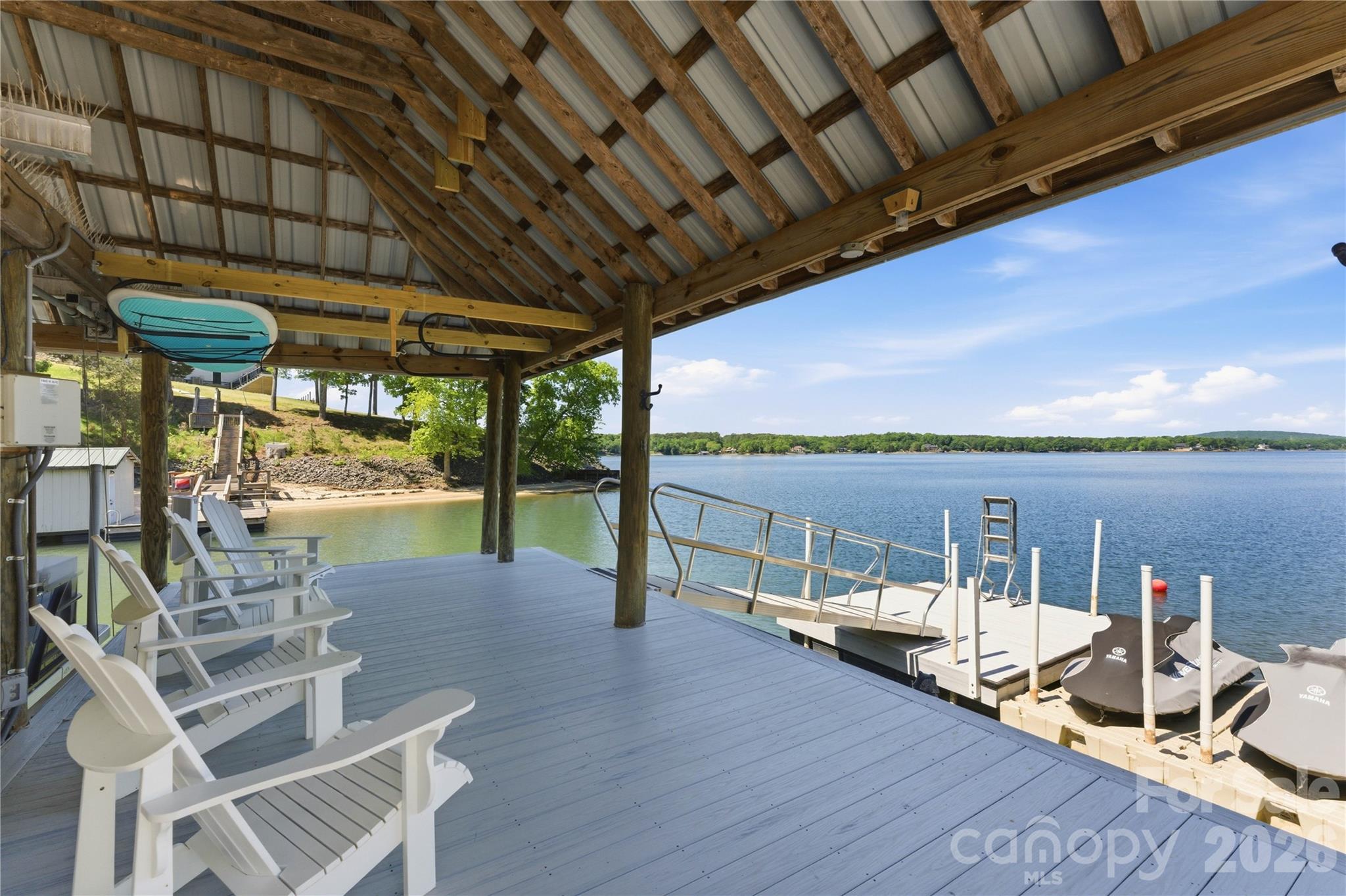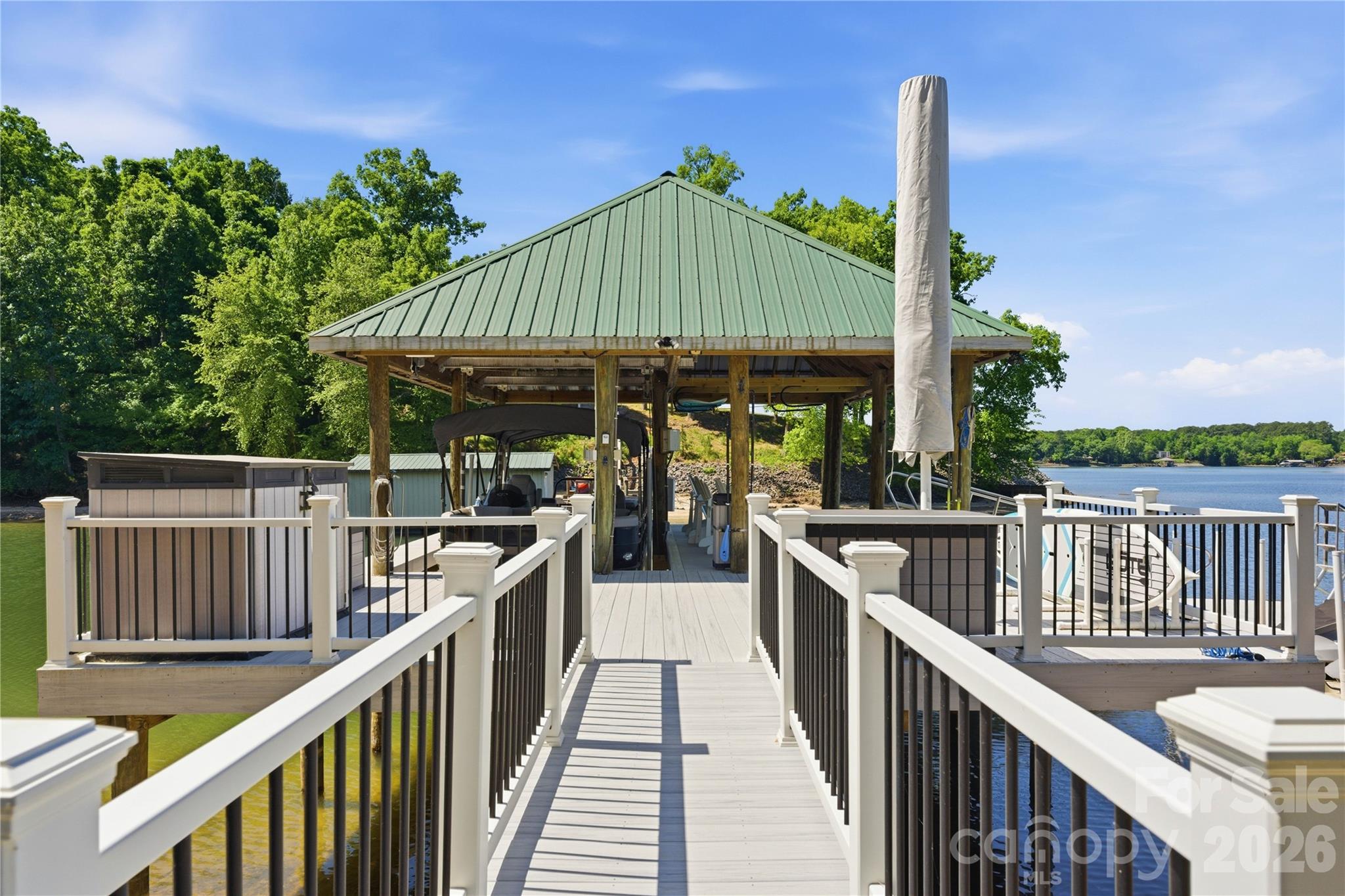 - Covered composite dock with boat lift, seating area, and floating dock